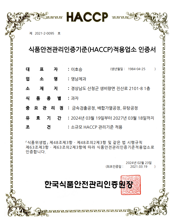영남제과 | 대표자 : 이호승 | 사업자등록번호 : 570-74-00155 | 주소 : 경남 산청군 생비량면 진산로 2101-9 | 전화 : 055-974-3100