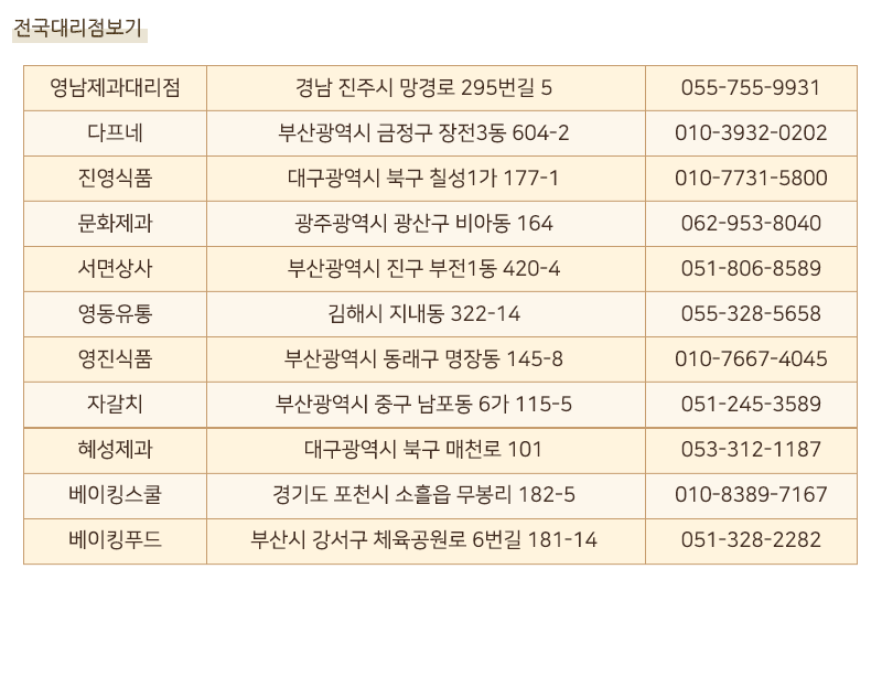 영남제과 | 대표자 : 이호승 | 사업자등록번호 : 570-74-00155 | 주소 : 경남 산청군 생비량면 진산로 2101-9 | 전화 : 055-974-3100